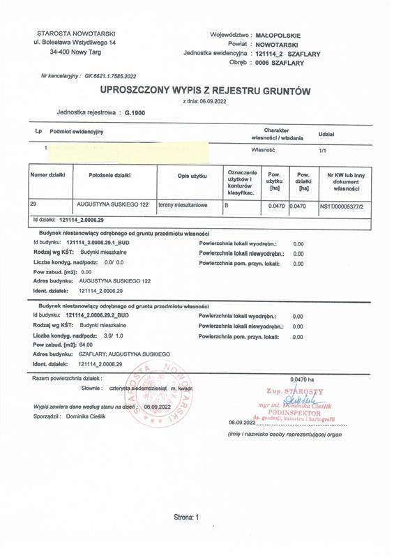 nieruchomości gruntowej zabudowanej, położonej w miejscowości Szaflary ul. Augustyna Suskiego 122, gm. Szaflary powiat nowotarski, woj. małopolskie posiadającej założoną księgę wieczystą w Wydziale Ksiąg Wieczystych Sądu Rejonowego w Nowym Targu o numerze NS1T/00005377/2 składającej się z działki ewidencyjnej nr 29 o powierzchni 470 m2 (0,0470 ha) zabudowanej budynkiem mieszkalnym w trakcie przerwanych prac remontowych o pow. użytkowej 247,78 m2, stanowiącej własność dłużnika: Król Marzena.